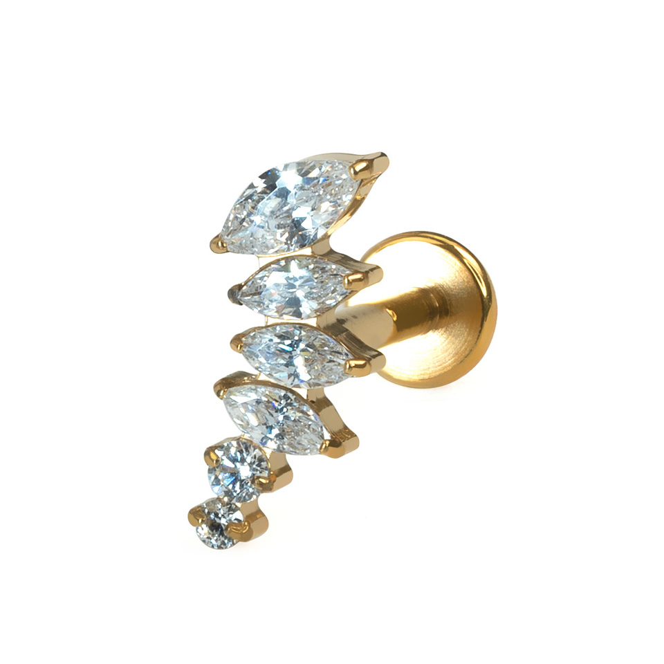 This labret features marquise cut CZ stones in decreasing sizes, arranged in a gentle curve, ideal for wearing in a piercing such as a helix, flat, or upper lobe, where the curve will follow the contour of your ear. This piece is closed with an internal thread, meaning that to wear it, you insert the smooth stem through your piercing and screw the top on to secure it. Crafted from titanium, this piece is suitable for those with sensitive skin.