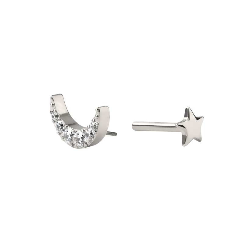 This beautiful titanium labret features a moon studded with CZ gemstones. Its star-shaped flat back makes it perfect for wearing in piercings where both sides of your jewelry are visible.