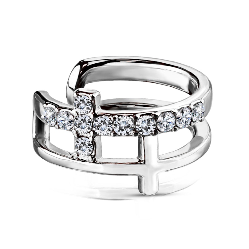 The design includes two crosses: a cross completely studded with stones, and one without stones. The crosses lay opposite each other, along with the elegance provided by the sparkling effect of the several stones.