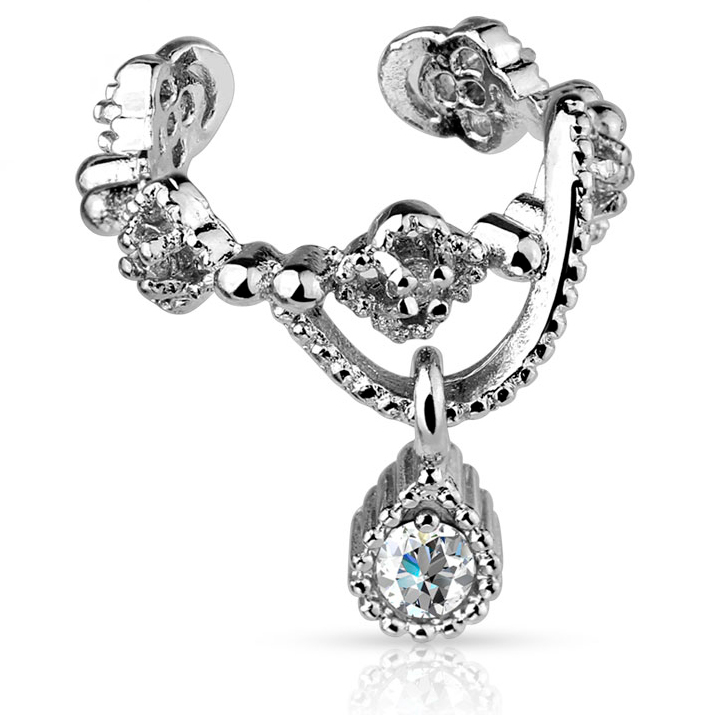 Your ears will be thrilled with this beautiful and elegant ear cuff, that you can wear without having a piercing hole. You can put the cuff on and apply some pressure on the outer edge of the ear rim so that it's set firmly and ready to show. It's perfect for you if you don't have a piercing yet but you want to see how it looks on you first before making the final decision.<br style="">The design of this jewelry is extra luxurious and extravagant. It has beautiful patterns, rippling waves, and a charming dangle.<br style="">There aren't many ear cuffs with dangles in the market; what you have in front of you is an exceptional piece. The dangle is drop-shaped; it will look as if a teardrop is falling from your ear! There's a round, crystalline-colored stone in the center of the dangle. The stone is carved with the well-known diamond cut, so it can reflect light. This brilliant mirror-effect is great for such a small cuff, worthy of any princess.