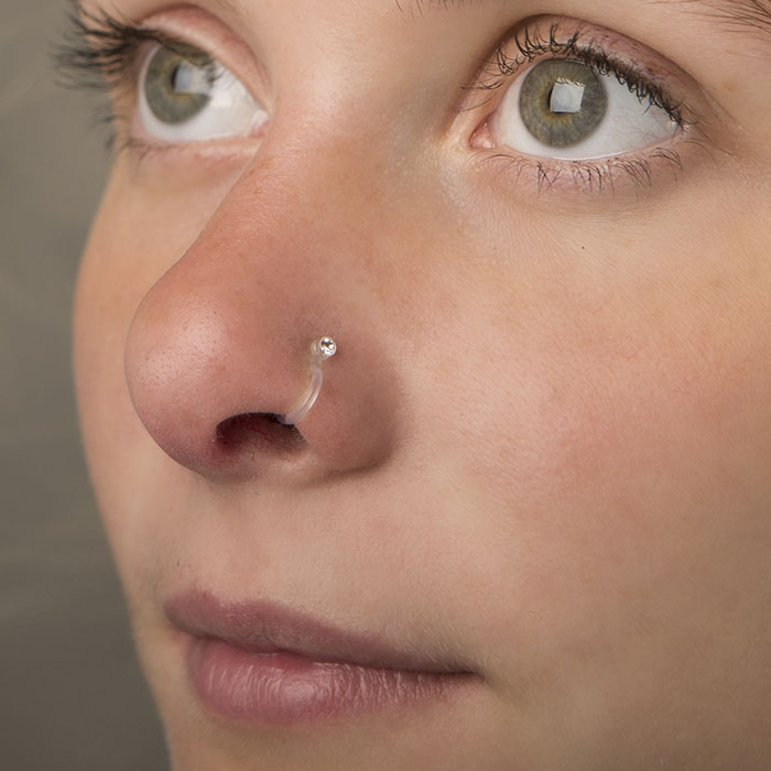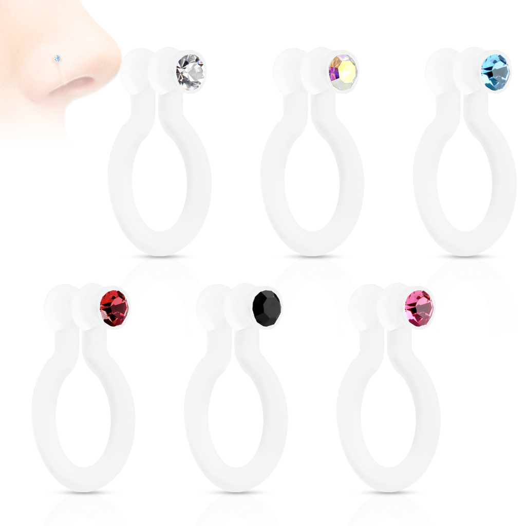 Get this fabulous fake nose piercing with a small stone, without getting your nose pierced. This tiny piercing looks like a ring in PTFE, a clear and soft material. It features a gem that is placed on your nostril. However, it's an open ring that gets attached to your nose when you press the sides.