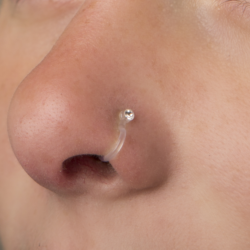The outer part of this nose piercing features a small stone, while the edges of the plastic material are flat surfaces, that make the attachment easier. The result is a stone on your nose that looks like a real nose piercing because the plastic is transparent. You can choose from six different colors. If you can't decide on one, the price is so reduced that you can buy two or three :)
