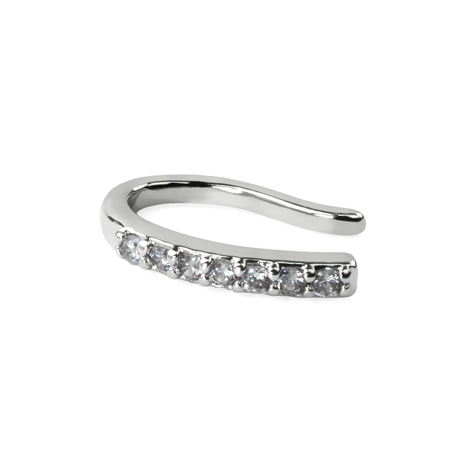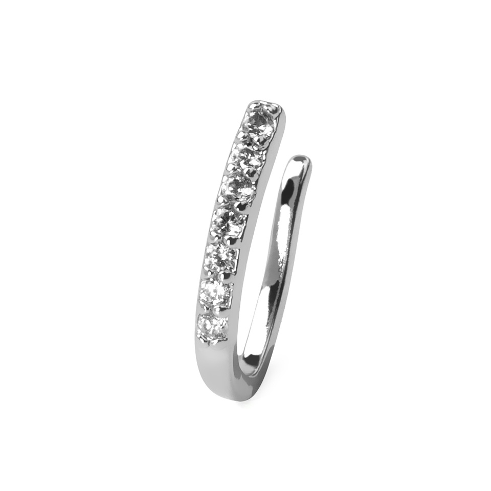 This piece has an approximate thickness of 1/16" (1 mm) or 18 gauge, and it also has, as you can see in the picture, a beautiful row of seven white zirconia. Since it's a fake piercing that doesn't go through the skin, it's made of brass and has a shiny silver plating.