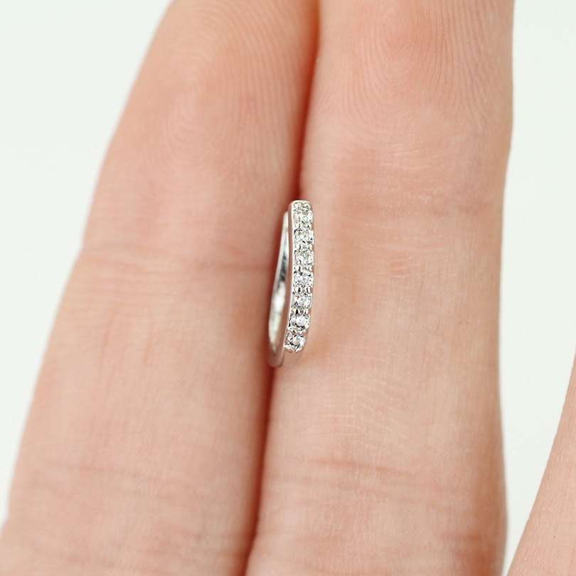 This piece has an approximate thickness of 1/16" (1 mm) or 18 gauge, and it also has, as you can see in the picture, a beautiful row of seven white zirconia. Since it's a fake piercing that doesn't go through the skin, it's made of brass and has a shiny silver plating.