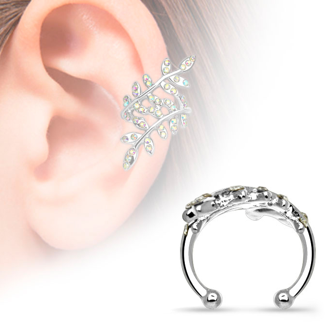 This elegant and detailed design jewelry is available in three different colors. Choose from silver or gold, both with white studded stones. But if you're looking for a more delicate model, you can get the silver model featuring stones with an aurora borealis effect. This kind of stone reflects light in rainbow colors. It creates a unique effect when the ear cuff moves.