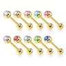 Beautiful tongue barbell plated in 14-karat gold, with a variety of gems in different colors.