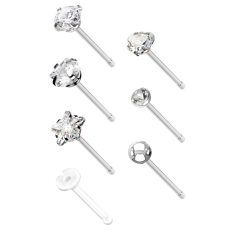 With this set, you can change your nose pin whenever you want. It's not necessary to change it every day, but if you like changing it often, this set will be great for you. All the studs in the set are made of surgical steel, except the retainer. The sizes are standard for all: a gauge of 20g (0.8 mm) and a length of 1/4" (6 mm).
