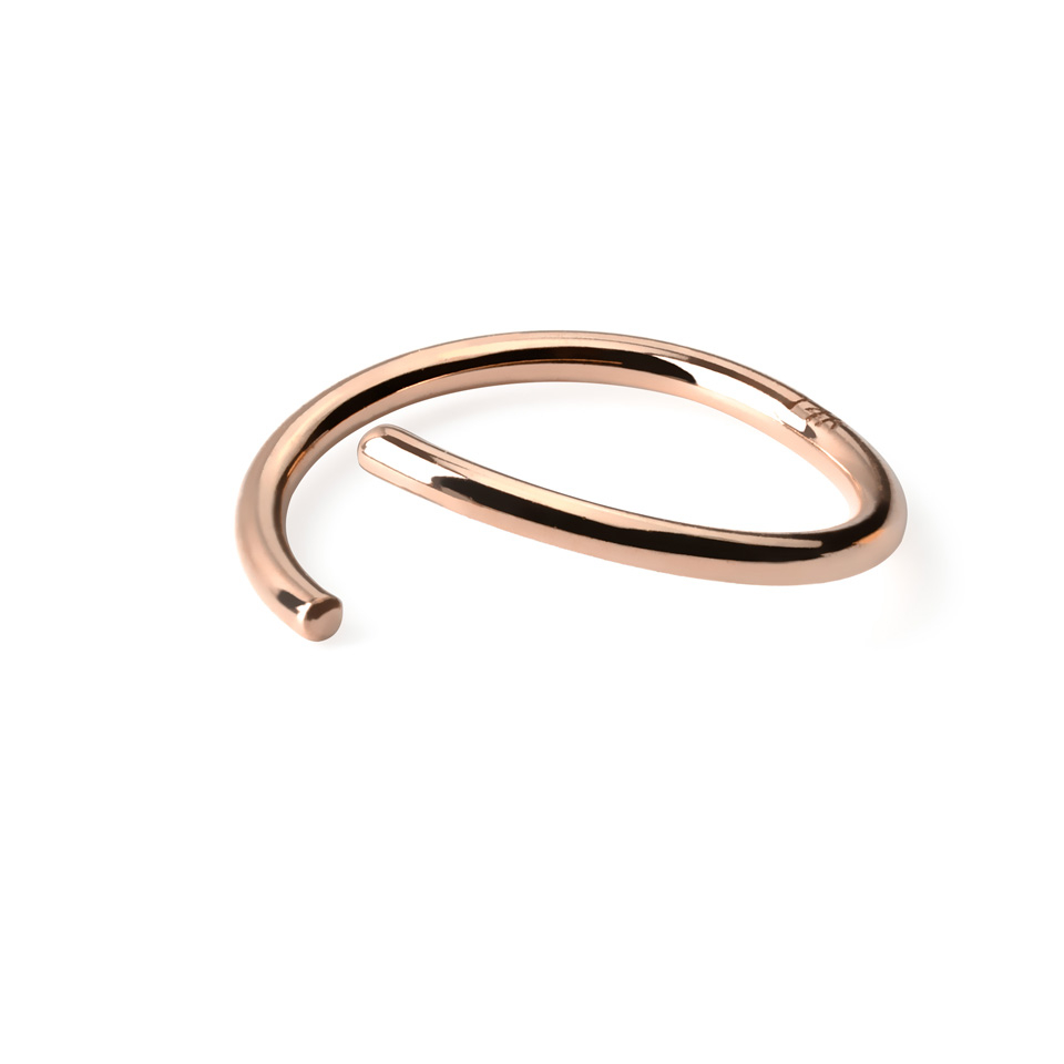 Minimalistinis vientisas žiedinis auskaras su itin paprastu uždarymo mechanizmu. Žiedas pagamintas iš 14k aukso, o norint jį įsisegti reikia paspausti ant auskaro galų, kad susiformuotų spiralė. Anga yra mažesnė, nei atrodo ant paveiksliuko. Iš tikrųjų, angos realiame gyvenime visiškai nesimato.
