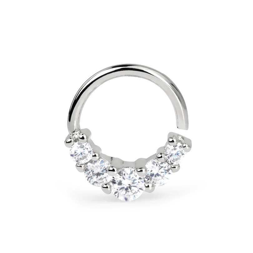 Žiedą, kurį čia matai vadina begaliu žiedu. Tačiau tai nereiškia, kad auskaras iš tikrųjų neturi galų, jie paprastai yra nematomi. Žiedas atidaromas paspaudžiant žiedo galą į bet kurį šoną ir uždaromas paspaudžiant galą atgal.