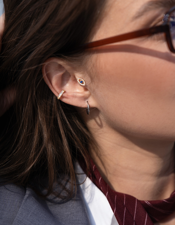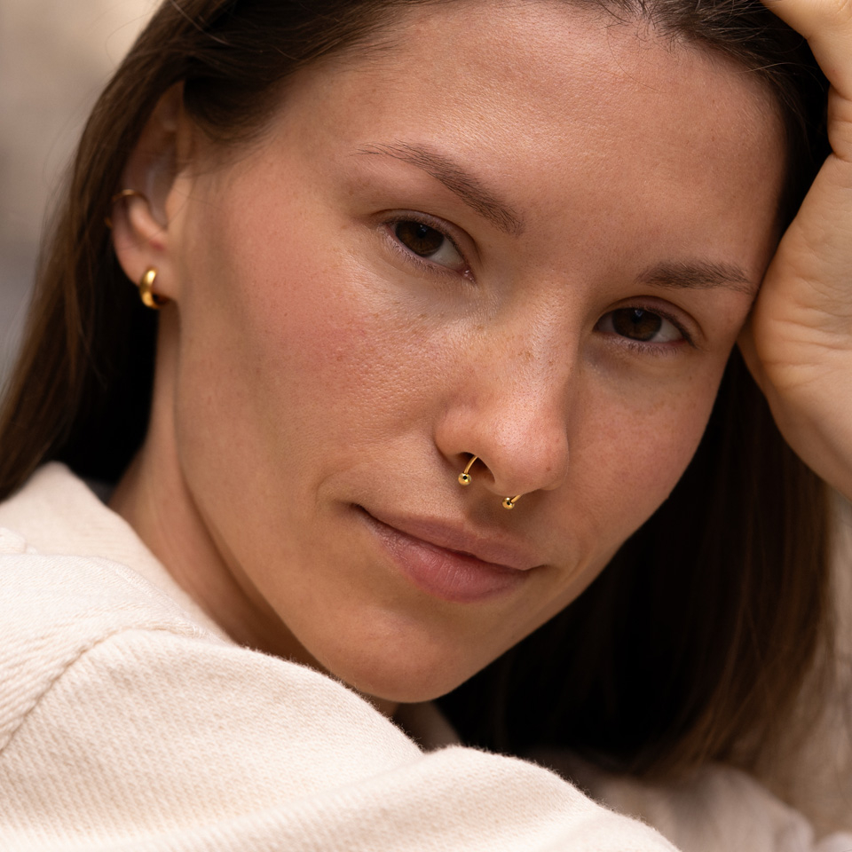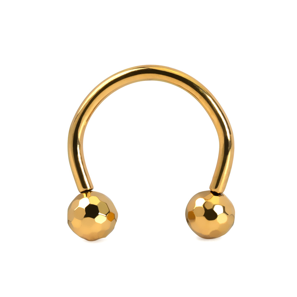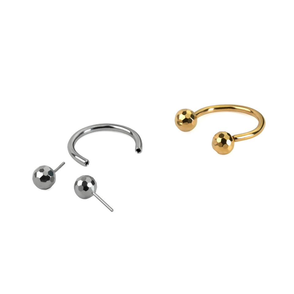 This titanium horseshoe is threadless, which means that the balls have small pins on them that push into the horseshoe to secure it into your piercing. The balls are multi-faceted giving them a cool textured look that brings to mind mini disco balls. This piece is suitable for various piercings, including eyebrow, ear, and septum, and is available in gold or silver finishes.