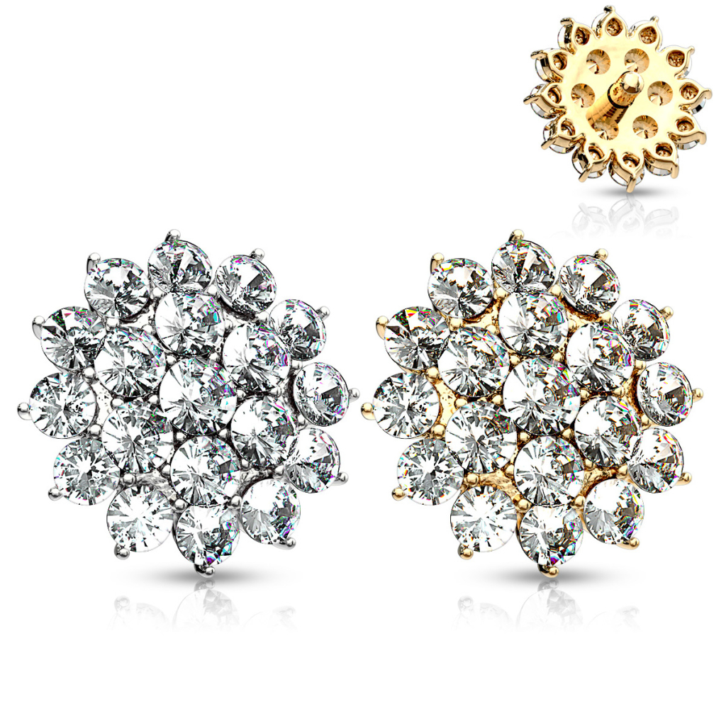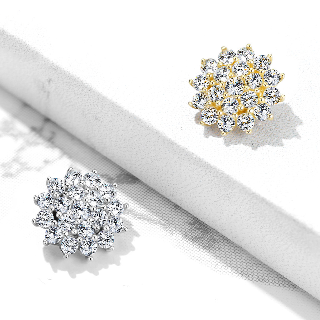 Here you will find an original piece of jewelry that will decorate your dermal anchor beautifully. The design features a flower that is covered with several clear stones that give it a superior shine. The stones are kept in place thanks to a prong-setting that holds every single one of them.