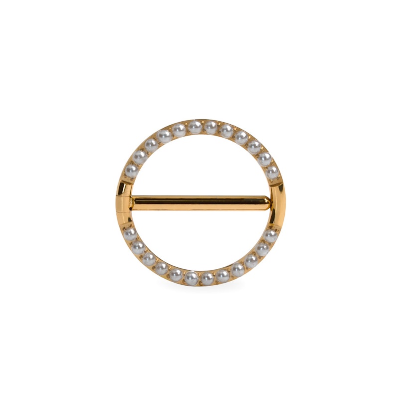 Šis perlais papuoštas titano clicker į spenelį rodo, kad perlai skirti ne tik vėriniams. Aukso arba sidabro spalvų laikikliuose išdėstytų perlų apskritimas jūsų auskaro vėrimo vietą įrėmina pasitikėjimo savimi nuotaika.