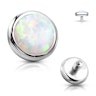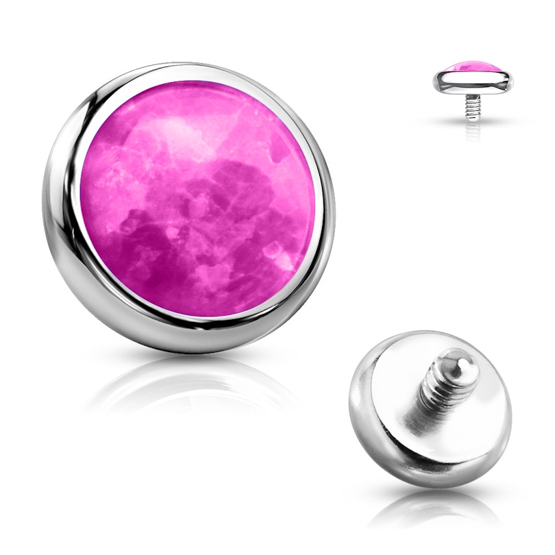 It is a sensational dermal top of exquisite design and a super bright look due to the beautiful bezel-set opal stone that it features. The base is silver in color and, as you can see in the picture, the stone only protrudes a little, so it looks practically flat. You can screw this beautiful gem into any part of your body where you have a dermal anchor previously inserted, without fearing it will get tangled in your clothing.