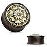 The beautiful motif on the front side has a golden layer that fabulously contrasts with the wood color. The plug is available in sizes up to 1-inch (25 mm) in diameter, so it can be worn even in large gauges.