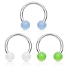 This is a fantastic set of three circular barbells in three different colors with glow-in-the-dark balls. The barbell is made of surgical steel, while the balls are acrylic. They glow in the dark if they're previously exposed to a lamp's light. With this set, you will get three circular barbells with balls in blue, green, and white.