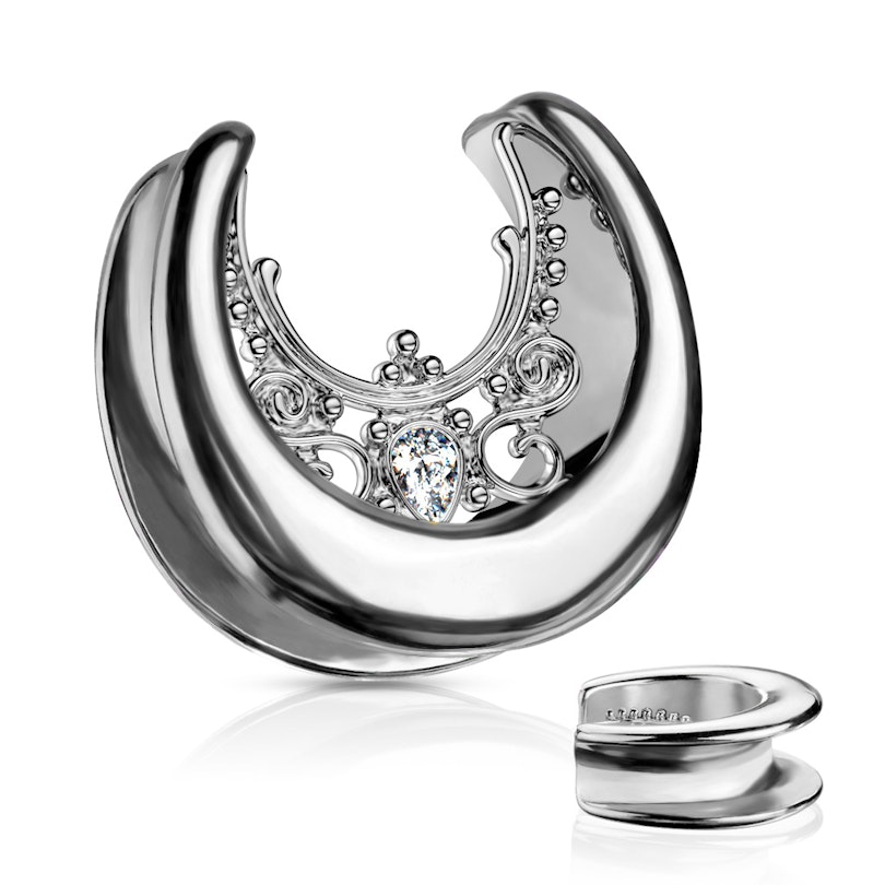 Nepanašus į kitus! Taip galima apibūdinti šį auskarą... Šis auskaras yra papuoštas ažūrinėmis vielutemis (filigranas), tai yra šio tunelio pagrindinis akcentas. Per vidurį sėdi lašo formos skaidrus akmenukas.