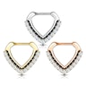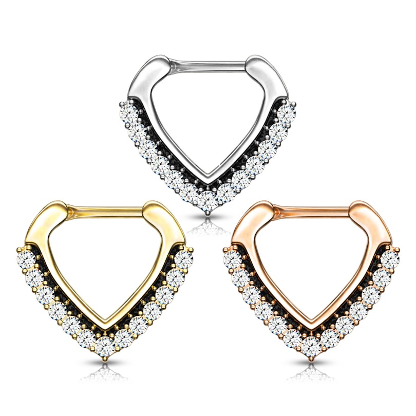 Auskaras turi V raidės formą ir yra pripildytas mažais kristalais. Strypas pagamintas iš chirurginio plieno ir žalvario, ir buvo nuspalvintas. Taigi sau labiausiai patinkančią spalvą gali pasirinkti čia.