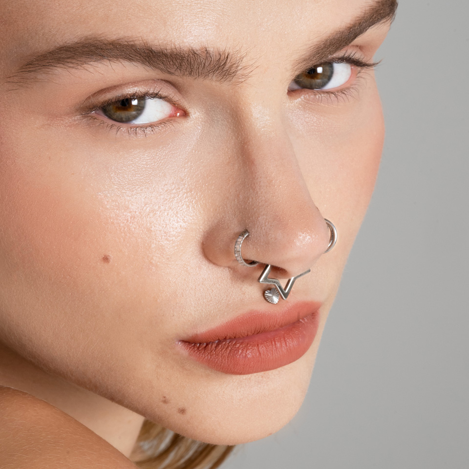 This ring features pave-set baguette-cut stones that lie horizontally to give a stunning effect. The stones give the ring a width of 2.4 mm. This ring opens and closes with a hinge, meaning it is simple to insert and remove from your piercing. This is perfect if you like to change your jewelry often. This piece will look fantastic in ear piercings such as lobe, tragus, helix, or rook.