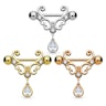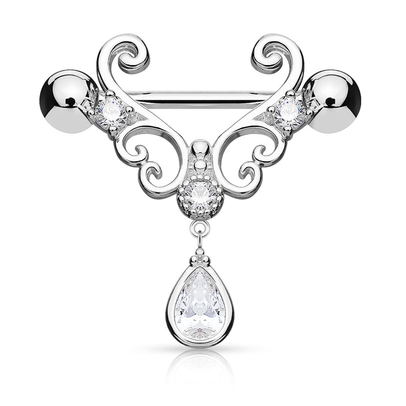 If you think the nipple shield in the picture is beautiful, believe us, it looks irresistible in your nipple piercing. The lovely shape of the shield frames the nipple impressively. It has a total of 4 stones; two on each side, and one in the middle; and the last stone, drop-shaped, hangs from the one in the middle. Besides, the jewelry has a heart and wavy shapes throughout the shield, creating an exceptional nipple barbell.