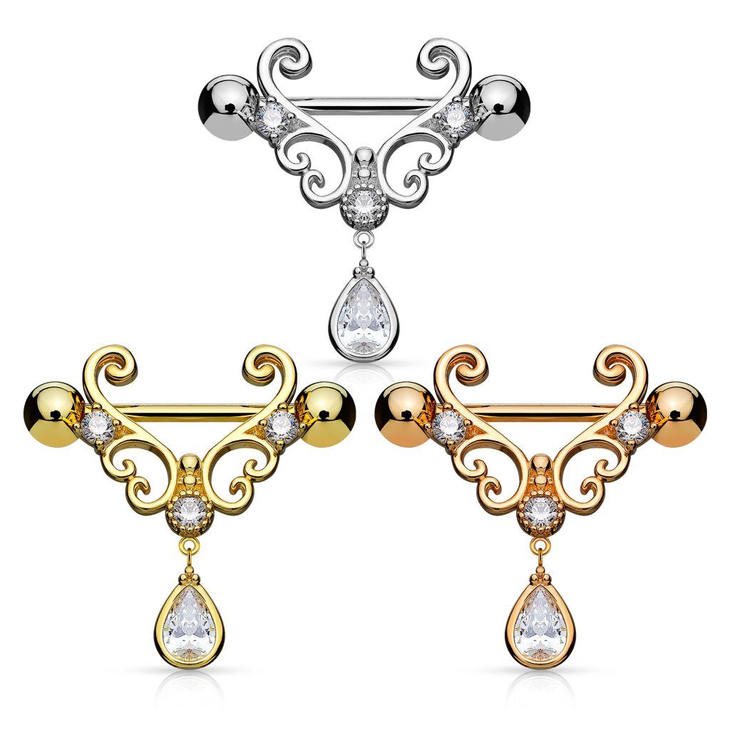 If you think the nipple shield in the picture is beautiful, believe us, it looks irresistible in your nipple piercing. The lovely shape of the shield frames the nipple impressively. It has a total of 4 stones; two on each side, and one in the middle; and the last stone, drop-shaped, hangs from the one in the middle. Besides, the jewelry has a heart and wavy shapes throughout the shield, creating an exceptional nipple barbell.