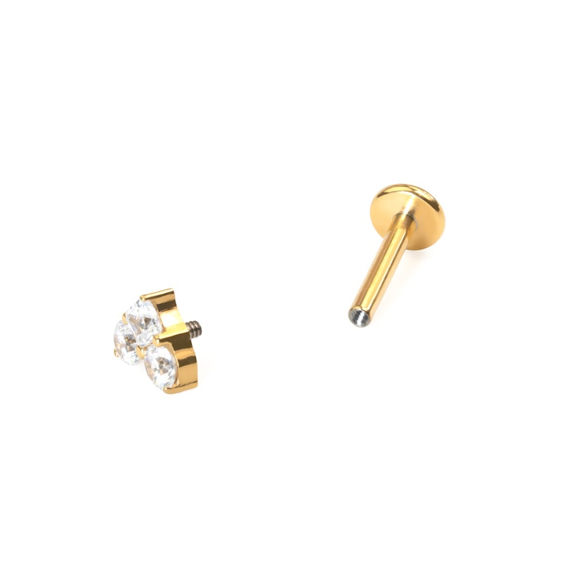 This titanium labret features 3 CZ stones arranged to form a heart shape. The top two stones are round and the bottom is square. It is internally threaded and available in a choice of gold or silver finishes. This cute piece will look great in a range of ear piercings. It measures just 5 mm at its widest point. The flat back ensures comfortable wear.