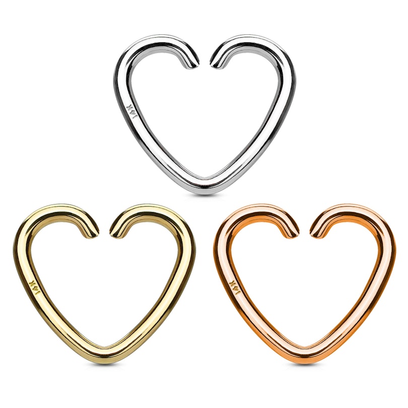You can buy this heart in different versions, in which you can choose the kind of gold, as well as the gauge that fits your piercing. The inside measurements of this heart are 10mm width by 9mm height. All the models have the same size, except for the gauges. You can wear this heart on most ear piercings, but they probably look best on the tragus, helix, and daith piercings.