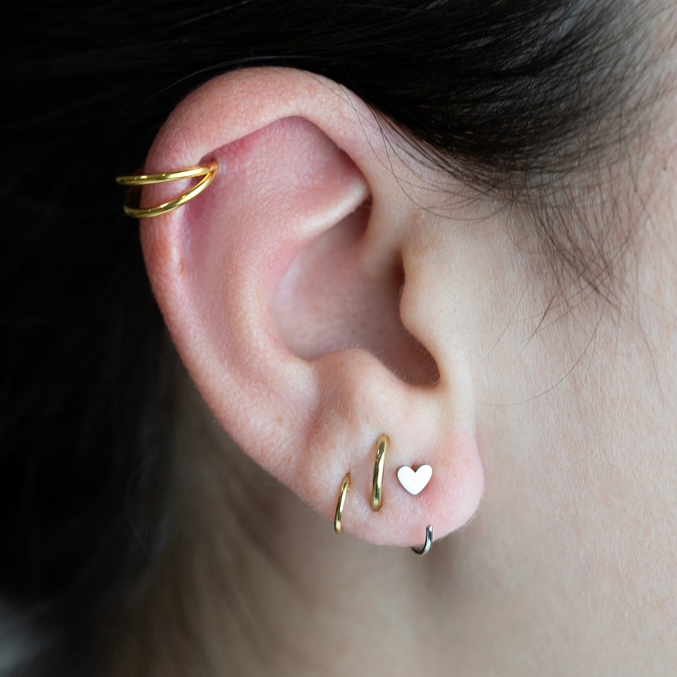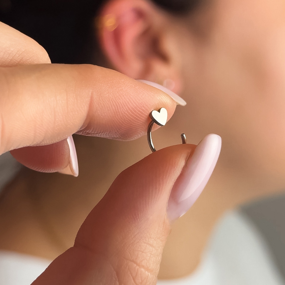 Titano atviras žiedas su širdute yra paprastas priedas, kurio trūksta jūsų ausų deriniui. Atviras lankas be vargo įslysta į ausies kaušelį. Tiesiog įstumkite atvirą galą per skylutę, pasukite į priekį ir leiskite natūraliai prisiglausti. Patogiai laikosi tiek pagrindiniame ausies kaušelyje, tiek viršutiniame, arba derinant su kitais žiedais. Širdelės detalė lieka nukreipta į priekį ir suteikia elegantišką, apgalvotą įvaizdį.