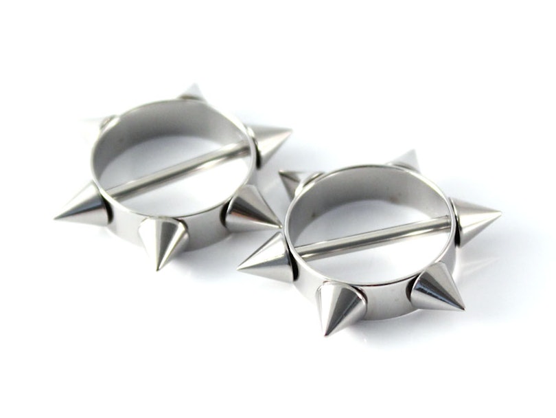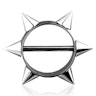 The shield is made of surgical steel, so it's ideal for most piercings. The inner diameter is about 9/16" (15 mm), and the spikes have a height of 3/16" (5 mm). The ring has a depth of 3/16" (5 mm), and a barbell that goes through it. It has the standard measures of a nipple ring so it can adapt to most piercings.