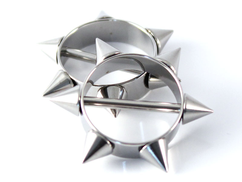 The shield is made of surgical steel, so it's ideal for most piercings. The inner diameter is about 9/16" (15 mm), and the spikes have a height of 3/16" (5 mm). The ring has a depth of 3/16" (5 mm), and a barbell that goes through it. It has the standard measures of a nipple ring so it can adapt to most piercings.