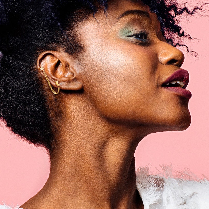 If you're lucky enough to have two ear piercings, you may be able to wear this piece of jewelry. Not all ear piercings are suitable due to the shape of the barbells. But if you have, for example, a piercing in the earlobe and one further up the ear, you can use it. The length of the chain is approximately 1.5" (4 cm).