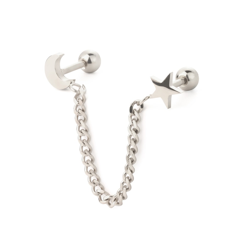 Pavadinimas: Barbell auskaras su mėnuliu ir žvaigždute sujungta grandinėle