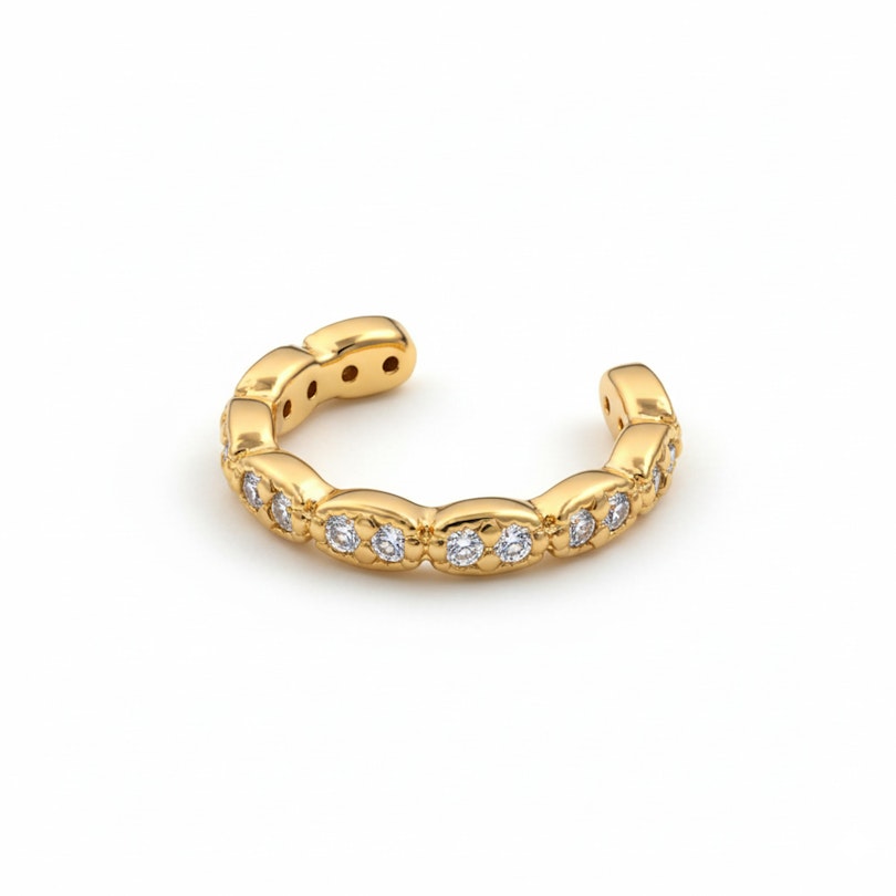 Subtilus netikras auskaras su akučių pora sukurtas subtiliam derinimui, o jums net nereikės įsiverti auskaro. Mažos akutės tvarkingai įstatytos laikikliuose ir suteikia tinkamą akcentą, tačiau išlaiko įvaizdį lengvą. Patogiai priglunda prie ausies. Galima nešioti vieną arba derinti su kitais papuošalais. Galima įsigyti aukso ir sidabro spalvų.