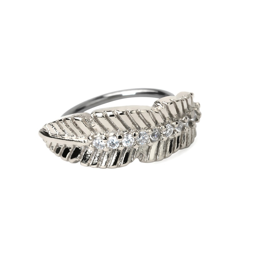 Suktas žiedinis auskaras su plunksna ir akmenukais
