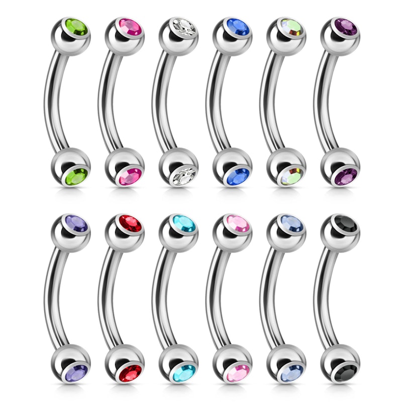 The two balls, on each end, have a diameter of 1/8" (3 mm). This is a quite discreet size if you want to use it in your eyebrow piercing. Both balls have a bezel-set gem that does not stick out. You can choose the gem from many different colors, choose your favorite one.