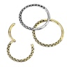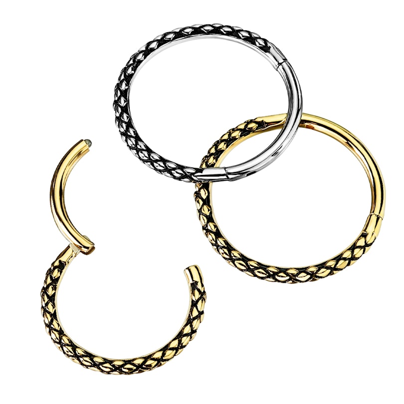 A hinged segment ring with snakeskin etched into the piece gives it a bold and stunning look and feel. The jewelry is available in silver color and gold color, both using the oxidizing technique to give a snakeskin look. The ring comes in 2 ring sizes: 8 mm and 10 mm, with 2 thread thicknesses of 1 mm and 1.2 mm.