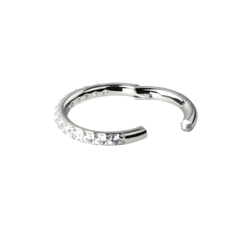 This segment ring made of solid 14-karat gold is available in different models - including an elegant 14k white gold option. On the visible outer side of the ring, there is a stone channel full of small clear stones that decorate the ring in a very classy way.