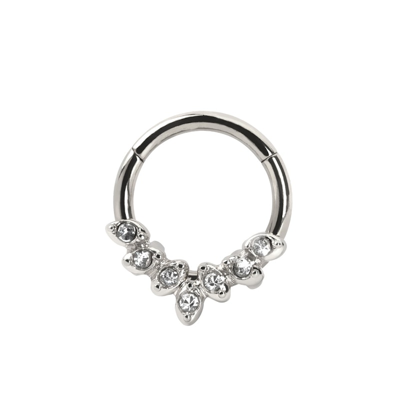 The ring has been coated with PVD, giving you a selection of colors to choose from. The ring also features a CZ leaf design consisting of 7 stunning stones in various colors that perfectly complement the different ring color options. These sparkling stones are forward-facing, making the ring perfect for septum piercing and certain ear piercings, like daith or tragus. Of course, you are free to use your imagination with placement, but pay attention to the size. The ring gauge size/thread thickness is 1.2 mm, which is standard for most facial piercings, and the ring diameter is 8 mm.