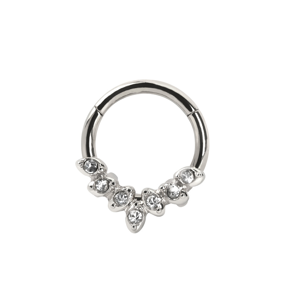 The ring has been coated with PVD, giving you a selection of colors to choose from. The ring also features a CZ leaf design consisting of 7 stunning stones in various colors that perfectly complement the different ring color options. These sparkling stones are forward-facing, making the ring perfect for septum piercing and certain ear piercings, like daith or tragus. Of course, you are free to use your imagination with placement, but pay attention to the size. The ring gauge size/thread thickness is 1.2 mm, which is standard for most facial piercings, and the ring diameter is 8 mm.