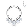 This ring is made of titanium, one of the best materials you can offer your piercing. This is also why it's used for initial piercing jewelry in new piercings. The ring has a gauge or thickness of 1.2 mm and is available in diameters 8 mm and 10 mm. No matter what diameter you select, the ring will have five stones at the bottom. The stone in the middle is the largest and the stones get smaller towards the ends, just like in a curved cluster.