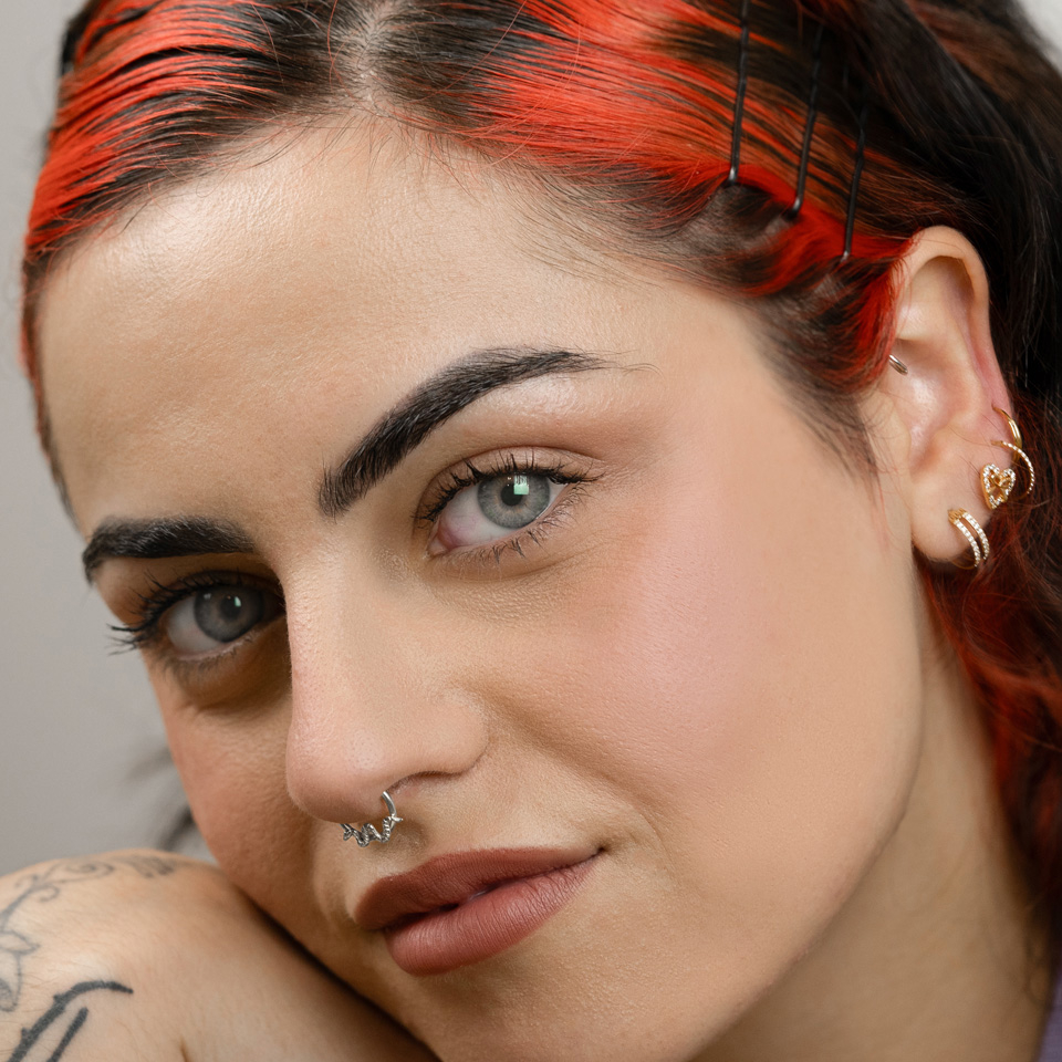 Hinged rings are a convenient jewelry choice in ear piercings, especially in tragus, anti-tragus, and rook piercings, where the space is minimal. The hinged ring doesn't have any detachable parts, and the mechanism is effortless to use. Simply pull the small hinged segment open, insert the ring in the piercing, and close it by clicking the segment back in place. This ring is made out of G23 titanium, which is the purest piercing jewelry material. You can even use titanium jewelry in new piercings, and it's the best choice for those suffering from nickel allergy.
