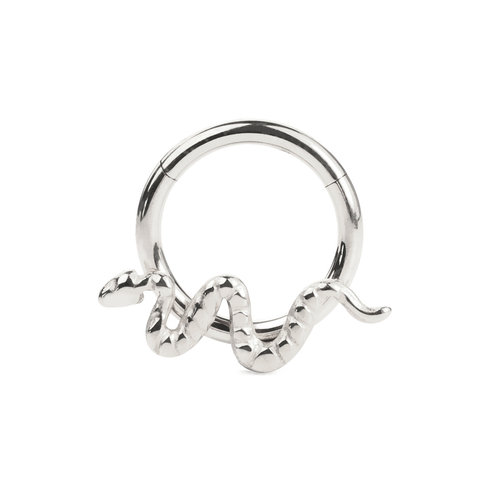 Unique about this ring is the stylish snake design that decorates the front. Bear in mind the snake's location on this ring when thinking about which piercing you want the jewelry for.