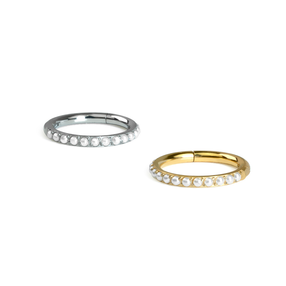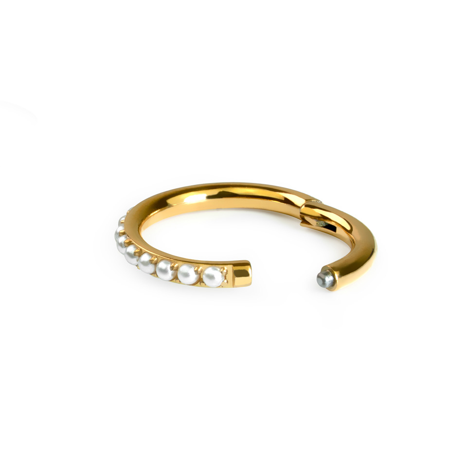 Add a touch of elegance to your piercings with this stunning hoop ring, studded with synthetic pearls for a chic and timeless look.