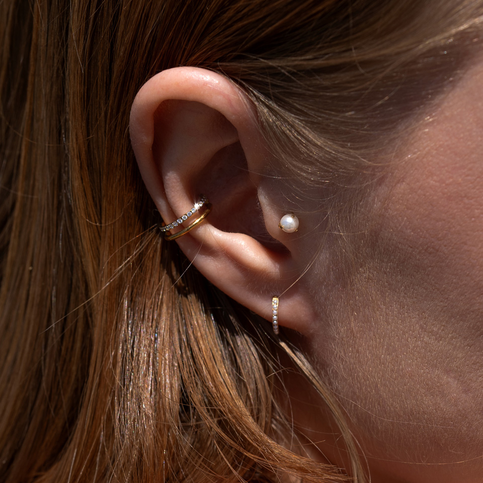Made from implant-grade hypoallergenic titanium, this piece is perfect for sensitive skin, ensuring long-lasting comfort and irritation-free wear. Available in silver or gold finishes, and in 8 mm or 10 mm diameters, this piece is ideal for helix, lobe and other ear piercings.