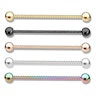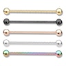 The barbell is available in several different colors, due to a long-lasting coating that lasts longer than regular platings. Both the bar and the balls are coated in the color of your choice. The balls have a diameter of 3/16" (5 mm). The bar has a gauge of 14g (1.6 mm) and a length of 1-1/2" (38 mm).