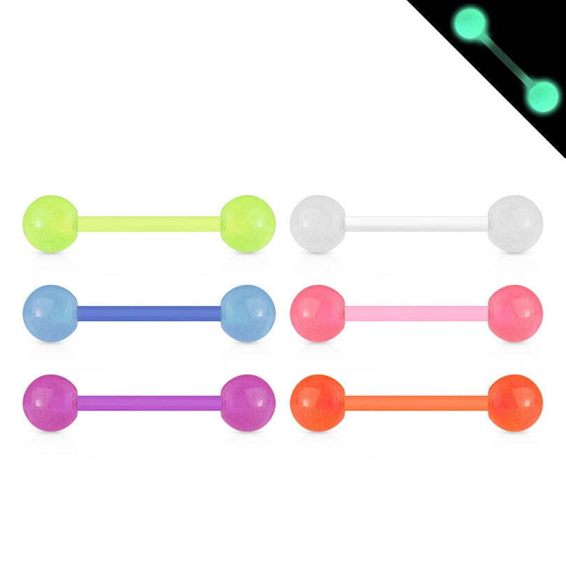 Here is a fabulous tongue barbell that glows in the dark. Choose from six different colors on the right of the picture.