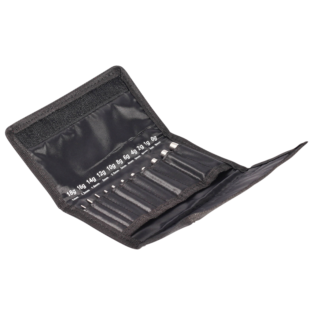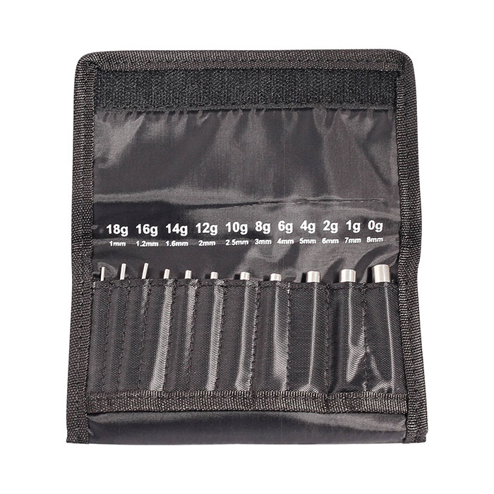 The small-sized set includes tapers from 18g to 0g (1 mm to 8 mm). The large-sized set includes tapers in gauge sizes from 00g to 13/16" (10 mm to 20 mm).
