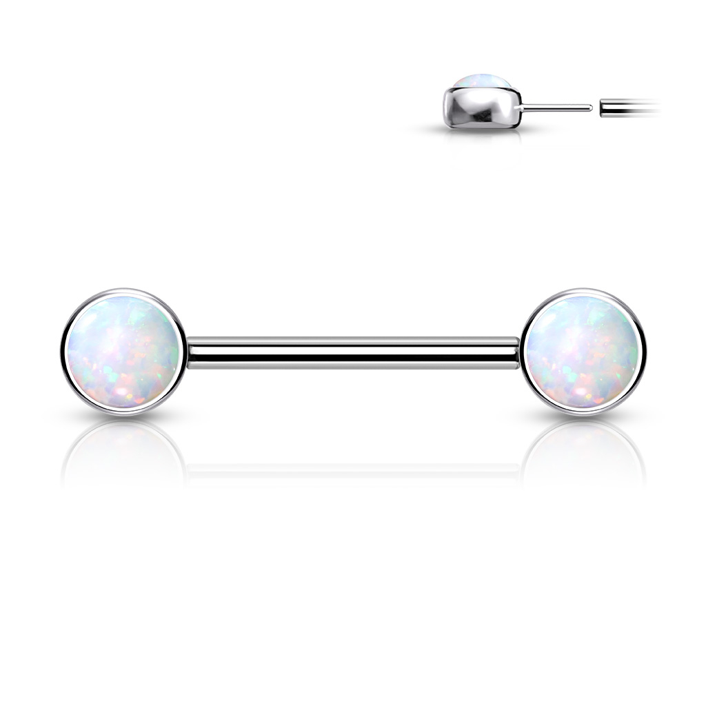 The entire piece of jewelry is made of titanium. The barbell has a length of 9/16" (14 mm), so it should fit most nipples. The balls are 1/4" (6 mm) big and flat at the back, so that they lie flat, depending on where in the nipple your piercing is. The opals in the balls are not real, but imitation opals. They're bezel set in the sphere, so no glue is used to attach them. You can choose from different colors.
