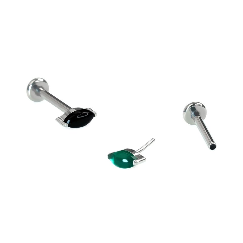 This titanium labret features a natural marquise cut onyx stone in a choice of green or black. The stone is held in place by delicate prongs.