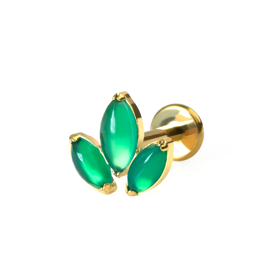 This stylish labret features 3 marquise-cut green stones arranged in a lotus flower design.