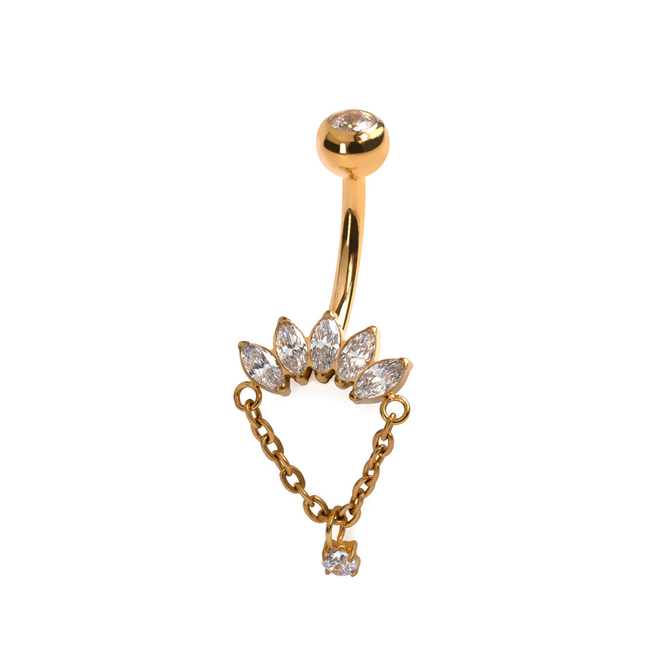 Šis titano auskaras į bambą su markizinio briaunavimo akutėmis ir pakabuku – ne šiaip paprastas titano barbell. Tai papuošalas su asmenybe. Markizinio briaunavimo akutės įstatomos kaip maža karūnėlė, o pakabukas prideda tinkamą kiekį dramos (nes jūsų auskaro vėrimo vieta nusipelnė būti dėmesio centre).